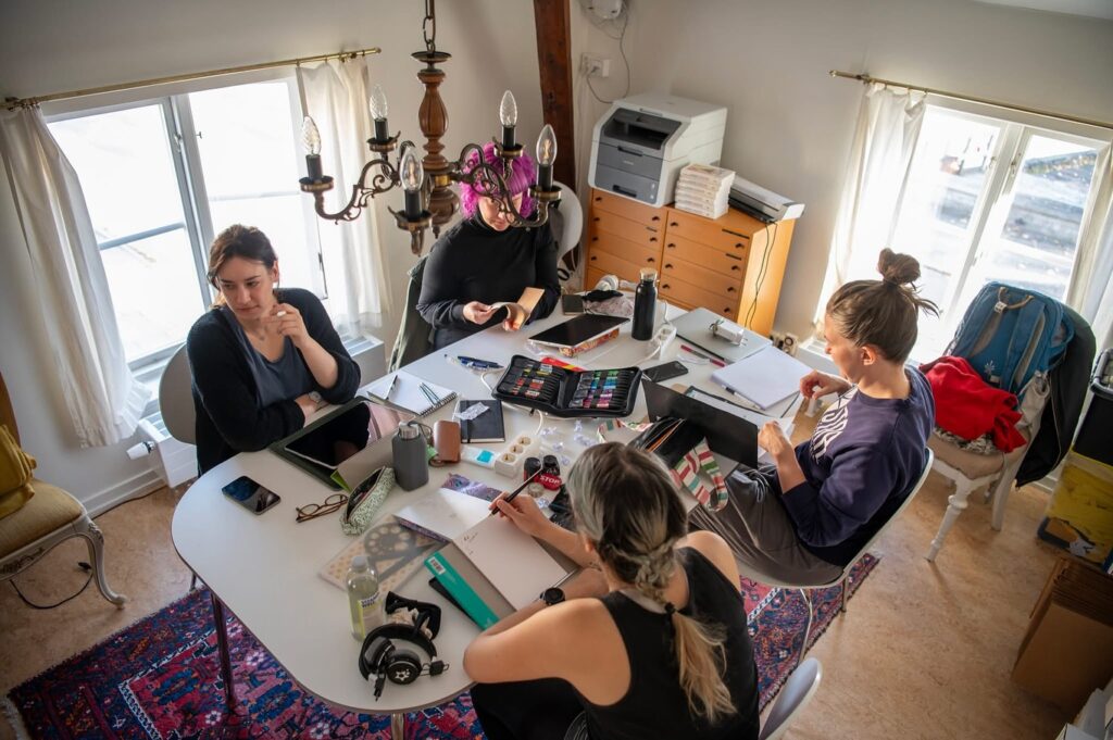 ”…Detta måste sägas: det här var den mest behagliga och smidiga versionen av 24-timmarsserien jag varit med om. Att inte behöva tänka på allt som berörde det praktiska runt arrangemanget var ljuvligt. Vi som deltog – vi var 4 deltagare då en person blev sjuk – fick alla måltider serverade till oss, vi hade varsitt hotellrum och ett helt hus med flera rum där vi kunde husera bäst vi ville. Vanligast är att man kör igång utmaningen kl 12, men vi körde igång redan kl 10 på förmiddagen. Först satt vi tillsammans och skissade, tänkte, lyssnade på musik, bara för att komma igång. Allt är spänt, allvarsamt, kanske också lite spännande. Sen började tecknandet komma igång mer, man slappnade av och började småprata, sjunga, falla tillbaka i kreativt tänk, och vips var klockan åtta på kvällen… Natten rullade på. Jag hade haft min kaos-period redan på eftermiddagen (då jag ifrågasatte samtliga beslut som hade nått fram till där jag var) och även återhämtat mig från denna, men flera gånger satt jag och undrade vad i helskotta jag höll på med, hur detta skulle gå. Till slut infann sig dock något slags lugn. En förlikning vid sakers tillstånd. Och rätt som det var, hade jag landat på 24 sidor. De var inte vackra, de saknade tusch och stadga och var helt och hållet i digital blyerts, jag hade inte hunnit renteckna allt… men de fanns!