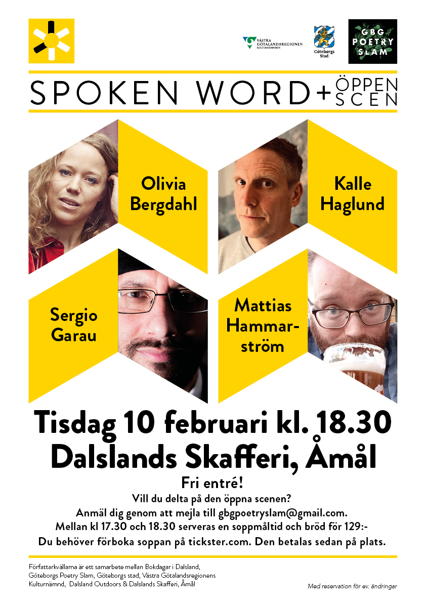 Författarkväll: Spoken Word+Öppen scen med Bergdahl, Haglund, Hammarström och Garau