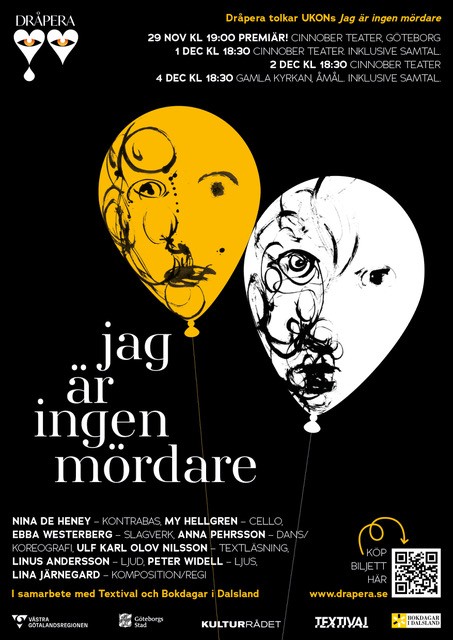 Göteborgsbaserade scenkonstkollektivet Dråpera tolkar UKON:s (Ulf Karl Olov Nilssons) diktsamling Jag är ingen mördare. En föreställning där musik, text, dans och aktion sätts samman i ett antal scener utan någon som helst koppling till varandra. Eller…?